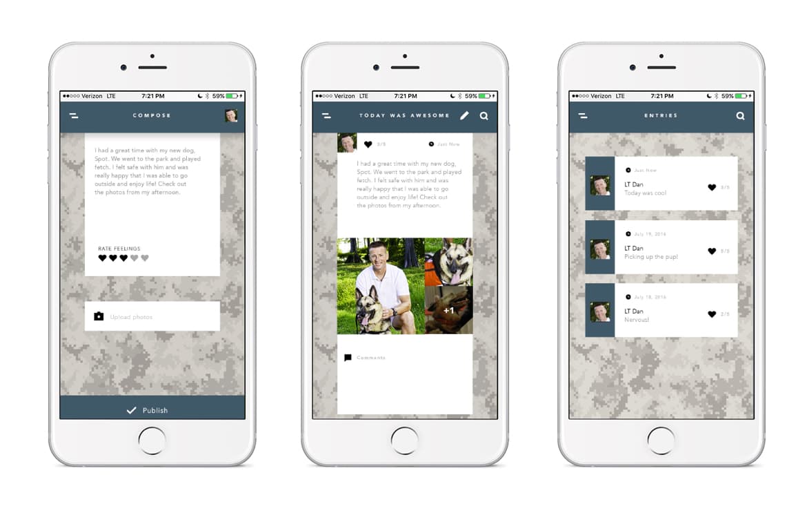 Check out the first prototype.The design for the app was a throwback to the uniforms to keep a level of comfort. Fellow veterans using DogLog could read other stories and offer words of encouragement if a veteran was feeling a bit down. The veterans can also rate their feelings. If the rating was 1 out of 5, the trainer can be notified to check in and make sure the veteran was in a focused state of mind.